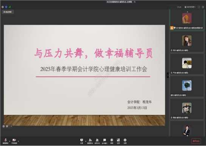 为提升辅导员心理健康水平,增强压力管理能力,会计学院于3月13日下午开展了主题为“与压力共舞,做幸福辅导员”的线上心理健康培训工作会议。会计学院心理板块负责老师程茂华主持会议并主讲内容,会计学院全体辅导员参加会议。