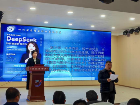 3月21日,智能科技学院产教融创中心教师谢卫婷受邀前往雅安市荥经县职业高级中学,开展主题为“人工智能赋能教育:DeepSeek助力教学革新”的专题讲座。此次讲座旨在分享人工智能技术在教育领域的创新应用,探讨如何通过AI工具提升教学效率和质量,助力教育现代化发展。荥经县职业高级中学全体教师参加了此次讲座,现场气氛热烈,反响积极。