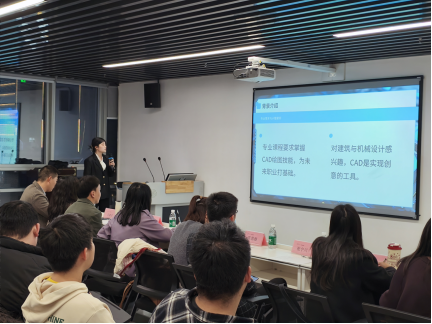 会议伊始,陈静介绍了本次答辩会的三大议题:CAD专业研修任务包成果分享和“英文文献阅读技巧与绘图软件应用”任务包成果展示以及“小思变大构—教学楼建筑设计”任务包成果分享与答辩汇报。她以“青苗”为喻,勉励学子扎根实践、锐意创新,在人工智能时代成长为复合型工程人才。
