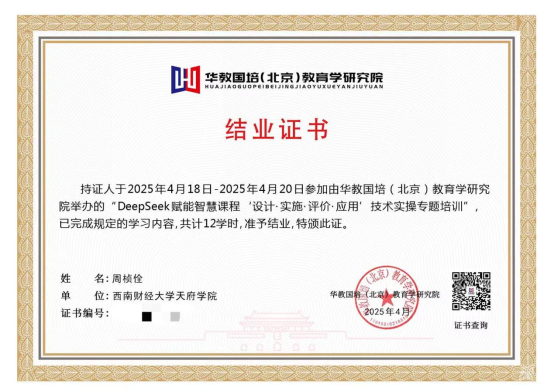 为积极落实国家教育数字化战略行动,促进智能技术与教育教学、科学研究深度融合,推动人工智能赋能教育转型,实现信息技术与教育教学深度融合,华教国培(北京)教育学研究院于4月18日至4月20日在厦门举办DeepSeek赋能智慧课程“设计·实施·评价·应用”技术实操专题培训会。工程与材料学院教师周桢佺受邀参与本次专题会议,并就DeepSeek在智慧课程建设与教学实践中的创新应用等方面在研讨会上展开学习与交流。