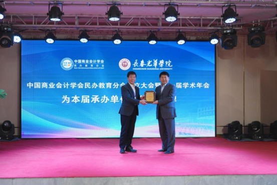 在闭幕式环节,民办教育分会对本次年会优秀征文获奖代表颁发证书,并公布了2026年年会承办单位决议。长春光华学院教务处处长张作岭代表学校领取了承办单位纪念牌;长春光华学院商学院院长周佰成院长代表学校完成了会旗交接仪式。新当选的民办教育分会会长王华在会议总结发言中向全体会员单位提出三点倡议:第一,以开放促发展,打破资源壁垒,实现优势互补;第二,以创新求突破,深化数智转型,培育民办高校会计学专业办学特色;第三,以质量树品牌,提升会计人才培养质量,服务社会经济发展。