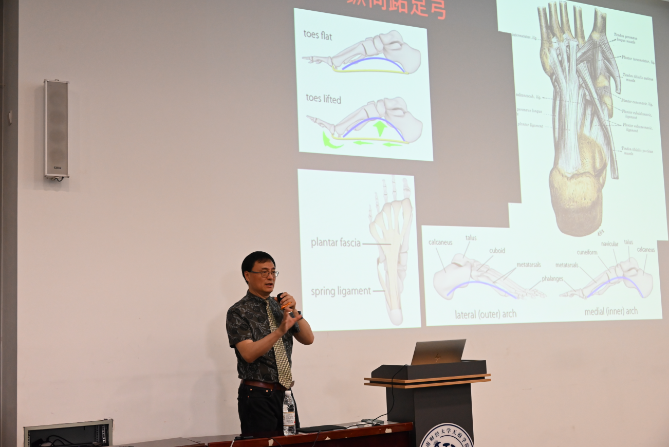 5月25日,在专题讲座环节,高信拱围绕《足踝生物力学与运动损伤康复临床实践》展开深入讲解,从足踝复杂的解剖结构入手,详细梳理了跗骨、跖骨、踝关节以及周围韧带、肌腱等组织的功能解剖特征。在实操演示环节,高信拱带领参会师生进行足踝区域的评估与干预实训,从手法触诊、活动度测试,到步态观察与动态平衡训练,帮助师生建立“评估—干预—再评估”的完整治疗思路。