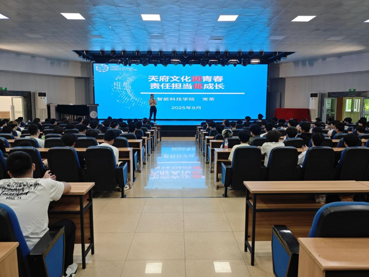 常荣以“天府文化润青春,责任担当促成长”为主题,向新生们娓娓道来天府文化的丰富内涵与精神价值。她从天府文化的认识理解出发,逐步延伸至学业规划、行动提升和就业发展,系统阐述了大学生应如何汲取地域文化养分,实现自我成长。她特别提出“一个头脑、两个工具、三个习惯、四个品质”这一凝练而富有启发性的文化精神框架,鼓励同学们在感悟天府文化独特魅力的过程中,不断增强文化自信,主动扛起传承弘扬优秀文化的责任,以青春之我、担当之我,在人生道路上坚定前行。