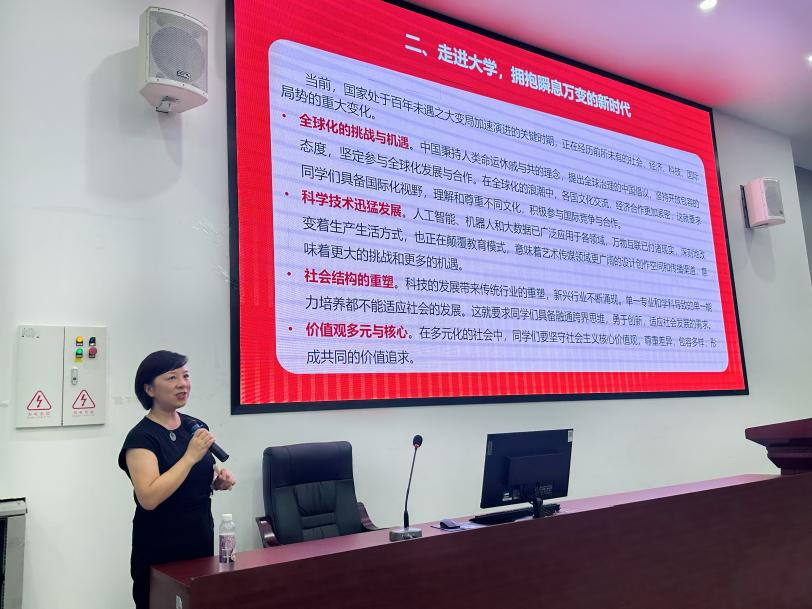 随后,彭雯秀围绕“青春筑梦·AI时代的成长与未来”与新生们交流。她结合学院实践案例与时代榜样故事,强调青年学子要将个人理想融入国家发展大局,既要树立“强国有我”的远大志向,也要锤炼“脚踏实地”的优良作风,为中国式现代化贡献青春力量。同时,她从校训出发,为新生学子解读了校训背后的深刻意义,对新生学子的生涯规划提出了建议与方法,也针对AI时代的冲击为同学们提供了对策与思路。对于新生适应期可能面临的困惑,分享了调整心态、规划时间、人际交往的实用方法,引导大家在遵守校规校纪的同时,积极参与校园文化活动,在集体中成长,在实践中担当。