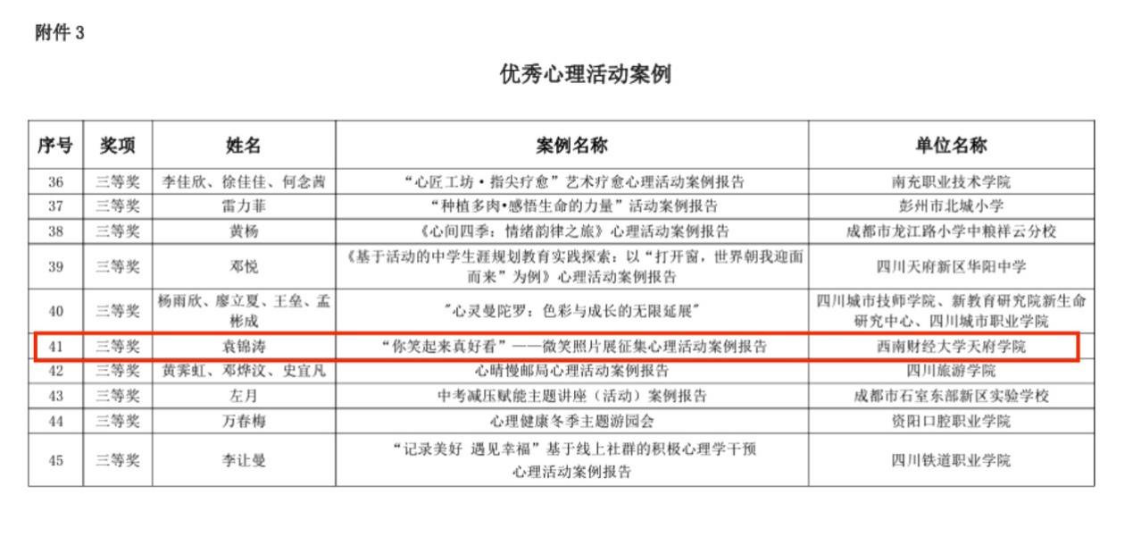 此次活动中,辅导员袁锦涛的“你笑起来真好看” ——微笑照片展征集活动案例报告在优秀心理活动案例类别中荣获三等奖,通过定格真实微笑,将温暖、乐观的情绪在校园内传递,缓解师生学习生活压力,营造轻松、友善的校园氛围,鼓励参与者主动发现身边的快乐瞬间,培养积极关注生活的心态,同时通过照片背后的故事分享,促进师生间的情感共鸣与交流,间接助力个人心理健康素养的提升。