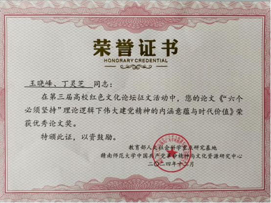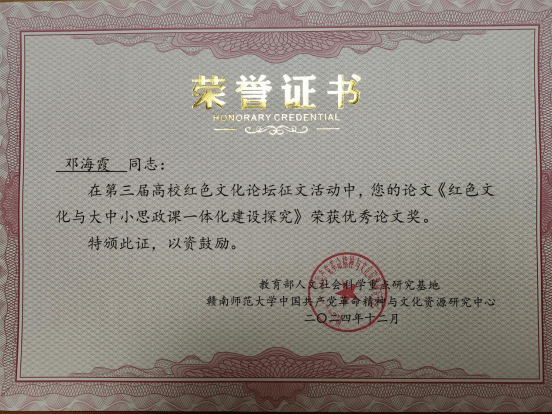 近日,由赣南师范大学主办,教育部人文社会科学重点研究基地赣南师范大学中国共产党革命精神与文化资源研究中心、全国红色基因传承研究中心赣州分中心和《红色文化学刊》编辑部承办的第三届高校红色文化论坛在江西赣州举办。学院教师邓海霞、王晓峰受邀参加此次论坛。