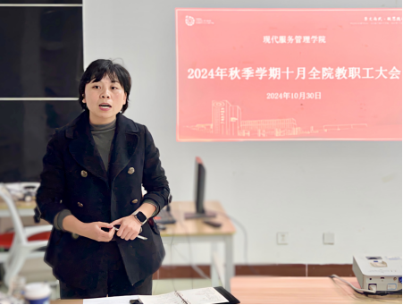 10月30日,现代服务管理学院于B6-1会议室召开了2024年秋季学期十月全院教职工大会。党总支书记倪娅副教授、执行院长何亮副教授、副书记潘兰、副院长高丹教授、副院长刘宇教授及全院教职工出席会议,会议由高丹主持。
