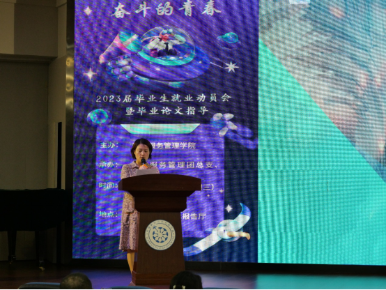 动员会的第二环节由倪娅做就业工作经验分享。首先,她将2022届毕业生数据与2023届毕业生数据进行对比,为同学们分析了2023届毕业生所面临的就业形势,鼓励同学们虽然我们所面临的就业形势较严峻但我们要迎难而上;随后,她从管理学院专业特点出发,为同学们指出了就业出路,并结合2022届就业工作指导经验分享给到场的同学,该如何从就业大军中突出重围;最后,倪娅对2023届毕业生就业提出三点建议:一是正确认识自己;二是多渠道获取就业信息;三是选择之后便坚定不移地走下去。