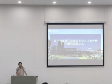 财务管理系副主任施琴以“大数据与人工智能背景下会计类专业人才培养转型与改革”为题讲解了培训收获。施琴首先讲到,从就业角度来看,会计教育改革迫在眉睫,而改革的核心在于人才培养方案的制定和融合课程的开发——其中会计人才培养转型可从开发数学统计基础与计算机程序设计课程、融合课程角度出发。这一方向有助于培养学生数据分析能力、数据思维、在专业领域应用机器学习技术的能力,以及对热门领域能力的深层次理解。施琴还以大数据会计、大数据审计、大数据与智能财务决策三门课程为例讲了教学安排和课程设计思路,以达成突破学科边界、帮助学生理解宏观环境、财务理论基本原理以及数据分析模型的目的,促进学生持续学习。