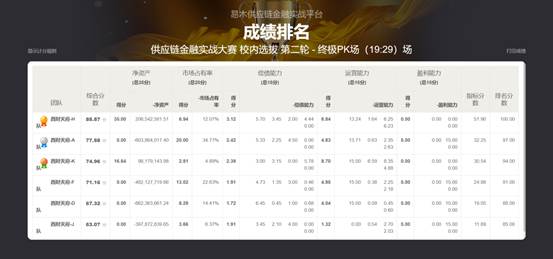 考虑到比赛使用网络、电源以及公平公正等因素,校内选拔赛在线上分两轮进行,第一轮比赛于11月9日开始,经过激烈角逐,产生6支队伍晋级第二轮比赛。第二轮终极选拔赛于11月10日开始,比赛过程跌宕起伏、精彩纷呈,有队伍稳定发挥,也有队伍“一失足成千古恨”,更有不断涌现的黑马,让赛事排名的变化捉摸不透。最终来自2022级物流管理01班4peri队和luck队获得胜利,将代表我校参加全国比赛。