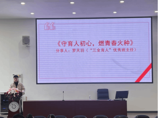 紧接着优秀班主任罗天羽围绕《守育人初心,燃青春火种》为主题进行了交流,助力每一位学生在专业领域发光发热,为他们的青春之旅点燃希望的火种;杨丹围绕《以专业引领与人文关怀,助力班级全面成长》为主题,分享了通过关心学生身心成长,专业融于班级管理、助力学生专业特色发展助力学生全面发展;石瑾仪围绕《好的关系就是好的教育》为主题 ,注重培养班级优良学风,充分发挥班主任在心理健康教育中的重要作用。