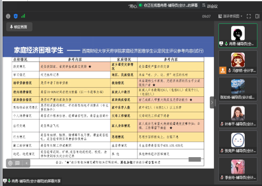 播撒爱心,成就未来。为积极贯彻落实国家资助政策,扎实稳妥地做好本年度学生资助工作,帮助家庭经济困难学生顺利完成学业。2022年9月15日下午,会计学院党总支副书记冯梦然、严飞雷和全体辅导员参加了企业微信线上培训,让辅导员们进一步了解贫困资助工作内容,从而对班级中的贫困学生给予更加精准的帮助。