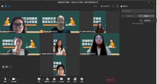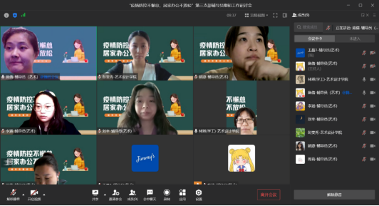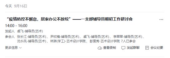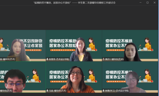 为进一步做好疫情防控下的新学期学生工作,精确把握学生工作新形势和新任务,促进辅导员工作规范化,确保新学期工作有序开展。9月15至16日,艺术设计学院学生第一、第二、第三、第四党支部召开“疫情防控不懈怠,居家办公不放松”辅导员期初工作研讨会,学院党总支书记彭雯秀、副书记林琳,以及各党支部本专科辅导员参加会议。此次会议就疫情防控下学院学生管理工作进行部署研讨,对于接下来的班级培育建设和专项学生工作进行思考和计划。