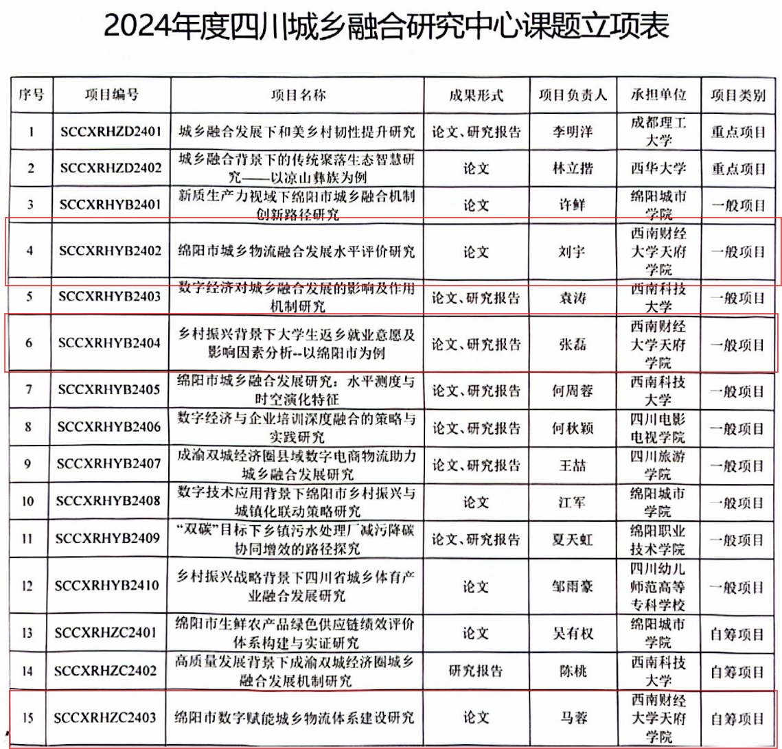 根据绵阳市社会科学界联合会近日下达的通知,现代服务管理学院院长助理刘宇教授《绵阳市城乡物流融合发展水平评价研究》、教师张磊副教授《乡村振兴背景下大学生返乡就业意愿及影响因素分析——以绵阳市为例》、教师马蓉《绵阳市数字赋能城乡物流体系建设研究》课题获批四川城乡融合研究中心2024年度“城乡融合研究专项课题”立项。