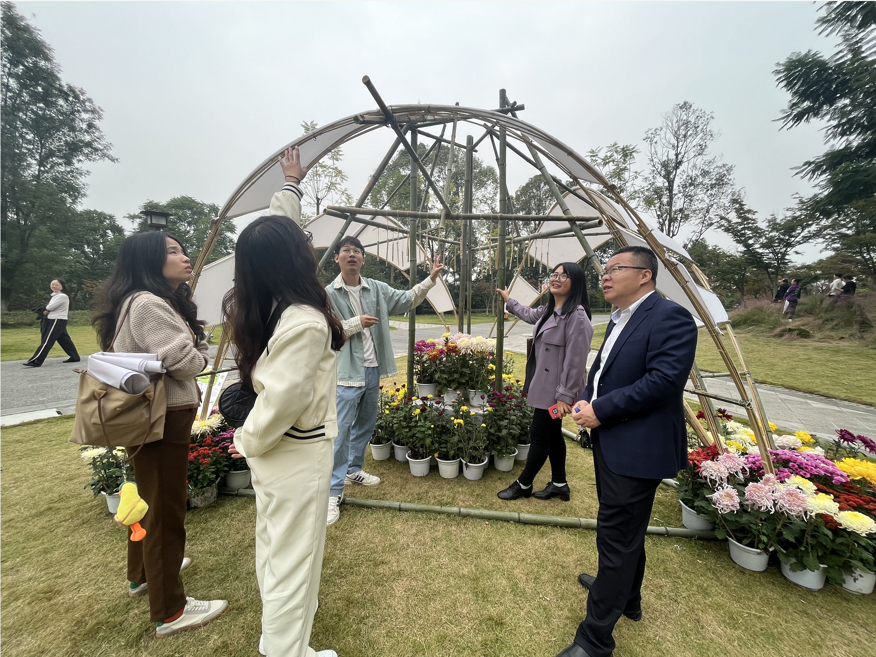 首先,建筑学教师袁枭函对“梦东山风云隽永,绘涪城青山美卷”高校建造节比赛主题以及整个构建节搭建的比赛规则进行了详细介绍。接着,袁枭函带领建筑学教师团队分别参观了西财开云kaiyun体育和西华大学、西南科技大学、绵阳师范学院等各校决赛队伍搭建的建筑模型,并详细讲解了在富乐山现场搭建的7天中,竹材处理和4米的搭建高度,使得任务完成难度较大,在已有2支队伍中途放弃的情况下,学校建筑学团队不畏困难、团结协作,在众多兄弟学校中表现优异,最终取得两项三等奖的佳绩。