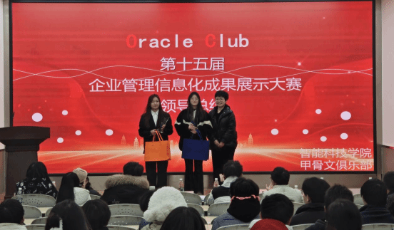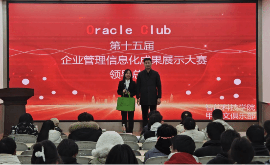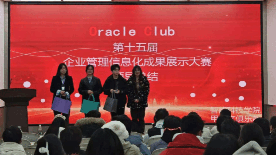12月12日晚,智能科技学院TF-SWUFE Oracle Club在实验楼110举办了备受期待的第十五届企业管理信息化成果展示大赛的决赛。本次大赛邀请学院院长徐鸿雁、副院长陈婷、学院信息媒体系主任李化作为嘉宾,学院教师郑茗桓、辜良成、谢欣岑、郭文静、贺雪琳以及各小组的指导老师们作为大赛评委,学院部分学生参加。