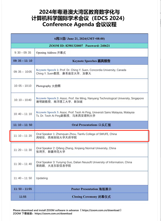 2024年粤港澳大湾区教育数字化与计算机科学国际学术会议(EDCS 2024)于6月21日在中国深圳召开。本次国际会议聚焦教育与人工智能技术应用,希望就教学方式与教育资源的全面改革,提高教育质量和效率并扩大教育资源和学习机会,在促进教育公平和社会进步、提升创新能力和人才素质等方面进行讨论与交流。学校建筑与工程学院教师周桢佺受邀参与本次国际学术会议,完成了主题为“新工科背景下的精益化教学模式和管理的改革与实践:以工程项目管理类课程为例”的校级教学改革项目成果交流的学术口头报告,得到了本次大会主办方、行业专家和参会人员的一致肯定和积极反馈。