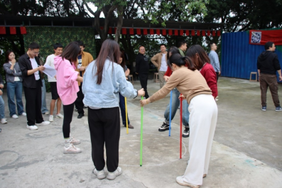 活动中,教师们积极参与了多项趣味游戏。首先是“气球还是排球”游戏,参赛者用头部顶气球展开激烈对决,充分展示了他们的灵活性和团队协作能力。接下来,“教练说”和“抢凳子”环节则进一步考验了大家的反应速度和执行力,现场既紧张又充满欢声笑语。而“珠行万里”“不倒森林”和“人多足少”等团队游戏则更加注重默契配合和协作能力,每一项活动都让教师们在轻松愉快的氛围中,深刻体会到了团队协作的力量与乐趣。