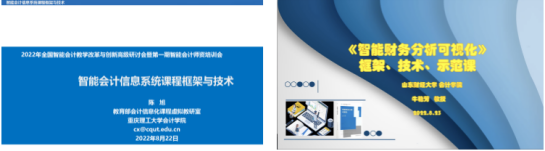 培训的第二个模块主要是课程培训。首先是重庆理工大学会计学教授、全国模范教师、中国会计学会会计信息化专业委员会委员陈旭教授系统介绍了《智能会计信息系统》课程,培训中系统介绍了《会计信息系统开发与设计》课程的框架与技术,教学组织和教学案例资源。其次是山东财经大学会计学院教授、智能会计系名誉主任牛艳芳教授系统介绍了《智能财务分析可视化》和《审计数据分析》两门课程的框架、教学内容和学时安排、案例资源等,为财务分析可视化类课程建设提供了较好的示范和借鉴意义。