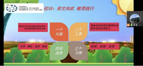 线上教学第一周的首天,由智能金融学院副院长陈蔚、陈娴进行“院长第一课”主题讲座,分别从专业特色、升学就业问题、学院特色讲坛、金融学CFA方向班、社会实践等问题展开详细介绍,多维度帮助新生融入大学生活、适应大学生身份。课堂上同学们积极参与互动,课后还分享了自己的心得体会,言语间尽是对大学生活的期待。