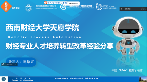 活动开始由我校会计学院老师陈语宣进行了教学改革方法分享。她从社会需求、学生就业压力、学生学情等方面分析了新财经人才培养的必要性,以及会计学院近几年来RPA课程在教学内容、上课的模式、以赛代考、赛证结合、校企合作等方面取得的一些成果进行了分享和交流。
