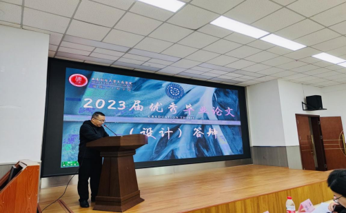 答辩会开始,由优秀毕业论文(设计) 组长韩记宣读答辩流程,答辩会第一项:学生陈述。学生应认真阐述论文的研究思路、研究内容和主要观点,并使用PPT辅助展示;答辩会第二项:答辩问答,学生陈述结束后,接受答辩组老师的提问,应辩学生应携带纸笔对答辩老师问题进行记录,并认真回答老师的问题;答辩会第三项:成绩评定,答辩结束后,答辩小组应为每位答辩学生写出不少于100字的评语,并按照本科毕业论文(设计)的各项指标给予相应的答辩成绩;答辩会第四项:结果宣读,所有学生答辩结束,答辩组进行评议并现场宣布答辩结果。