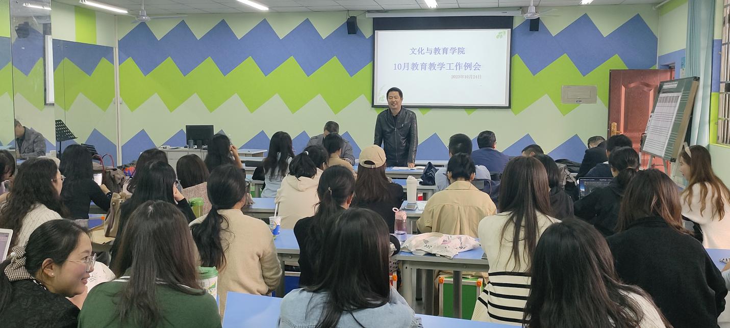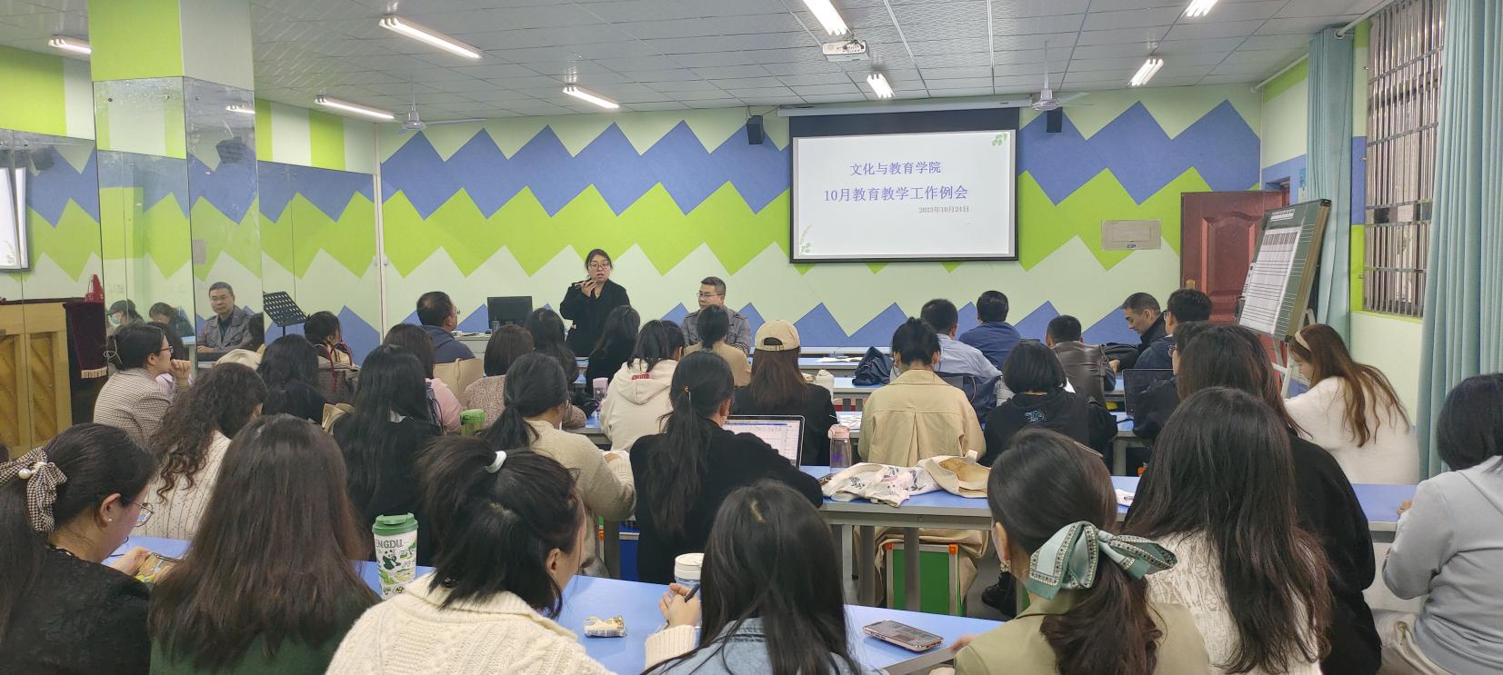 10月24日下午,文化与教育学院在三教声乐室召开了10月教育教学工作会议,学院党总支书记邓毅、执行院长史正刚、副院长史海静、张维及全体教职工参加。