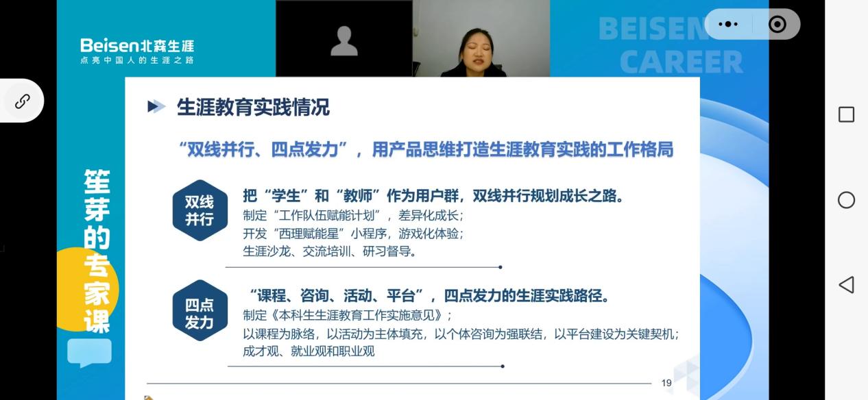 此外,王佳还详细介绍了“双线并行、四点发力”的理念。她提到,通过这个理念可以运用产品思维来构建生涯教育实践的工作格局。随后,她深入阐述了大学生生涯教育阶段任务以及生涯教育实践情况等方面的内容,鼓励各位老师设计人生的增长引擎,找到自己的正向循环。
