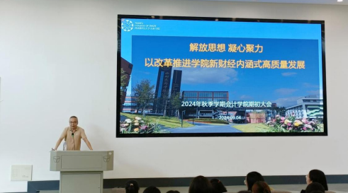 最后,陈真子从会计学院基本情况、2024年春季学期工作小结、学院发展以及2024年秋季学期工作部署等逐一进行汇报。其中,重点阐述了会计学院的使命和愿景,并强调学院致力于培养具有国际视野、创新精神和实践能力的新财经人才。她提到,学院自2015年开始转型以来,始终坚持明确目标导向,聚焦关键问题,注重实际成果的产出,确保转型发展的有效性和实效性,并特别提到了从“就业—招生—培养”联动机制出发进行的教育教学和人才培养改革。学院新学期再出发,新财经建设一张蓝图绘到底,持续做更高水平更具特色的新财经教育。