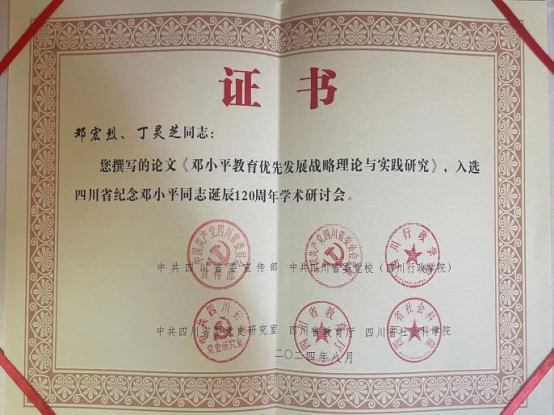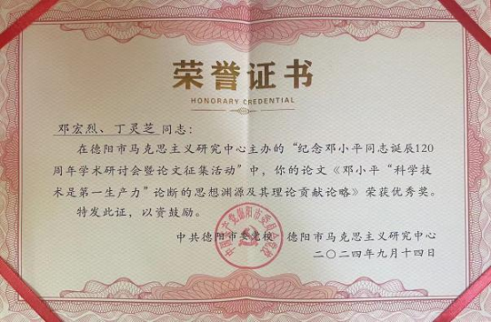 9月,德阳市马克思主义研究中心举办的纪念邓小平同志诞辰120周年学术研讨会在中共德阳市委党校举行。邓宏烈应邀参会,其撰写的论文《邓小平“科学技术是第一生产力”论断的思想渊源及其理论贡献论略》荣获优秀奖。