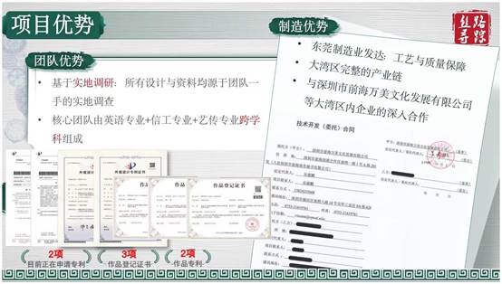 文化赋能方面,多个项目以科技激活传统文化,为“一带一路”建设提供文化支撑。外国语学院的《丝路粤章:建设“一带一路”文化传播文创智造品牌》项目融合3D建模、AR/VR等技术,经7年实地调研挖掘“陆丝+海丝”文化内涵,打造系列文创产品,构建“文化IP+数字技术+产业转化”完整链条,破解文创市场发展困境。创新创业学院的《AI聚能•粤红新程:广东革命老区数智全域臻品直达传播矩阵》项目整合AI+VR技术,提升红色文化内容制作效率80%、降低成本60%,创新“直播+VR/AR”助农模式,实现红色文化传播与特色农产品销售双向赋能,为革命老区振兴注入新动能。