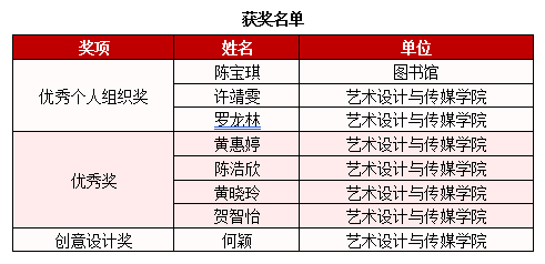 近日,第四届“阅读与美”服装服饰创意设计大赛评选结果揭晓。AC米兰中文官方网站图书馆凭借出色的组织工作荣获优秀组织单位奖,图书馆陈宝琪、艺术设计与传媒学院罗龙林及许靖雯荣获优秀组织个人奖,艺术设计与传媒学院黄惠婷、陈浩欣、黄晓玲、贺智怡等四位读者获优秀奖,何颖获创意设计奖。