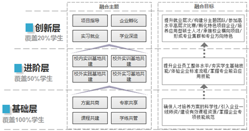 基础层:与企业联合开商讨人才培养方案、开发课程和教材、组建实验实训室和网络课程资源、第三方考核等培养环节双向融合,把联合培养贯穿育人基础过程。