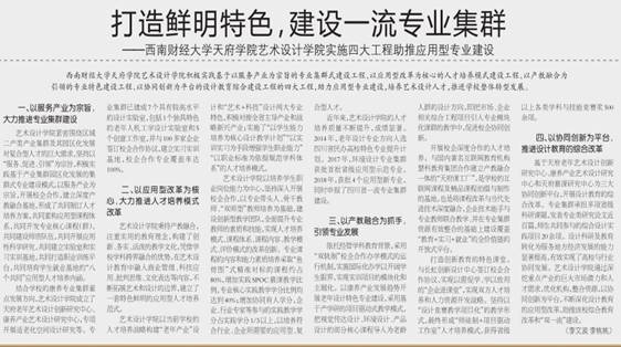 基于天府老年艺术设计创新研究中心、康养产业艺术设计研究中心和天府慕课研究中心为三大协同创新平台,开展设计教育的综合改革。专业集群承担多项省级科研课题,发表专业类研究论文近百篇,师生共同参与的综合设计实践项目20余项。设计科研及教育转化为服务地方经济发展的能力显著提高,有效实现了高校与行业协同发展。艺术设计学院通过深挖重点产业的巨大市场潜力和人才需求,优化机构,整合资源,以协同创新为平台,不断深化设计教育的应用型改革,助推我校综合教育改革和双一流建设。(李文波 李桃桃)