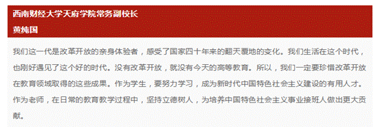 我们这一代是改革开放的亲身体验者,感受了国家四十年来的翻天覆地的变化。我们生活在这个时代,也刚好遇见了这个好的时代。没有改革开放,就没有今天的高等教育。所以,我们一定要珍惜改革开放在教育领域取得的这些成果。作为学生,要努力学习,成为新时代中国特色社会主义建设的有用人才。作为老师,在日常的教育教学过程中,坚持立德树人,为培养中国特色社会主义事业接班人做出更大贡献。