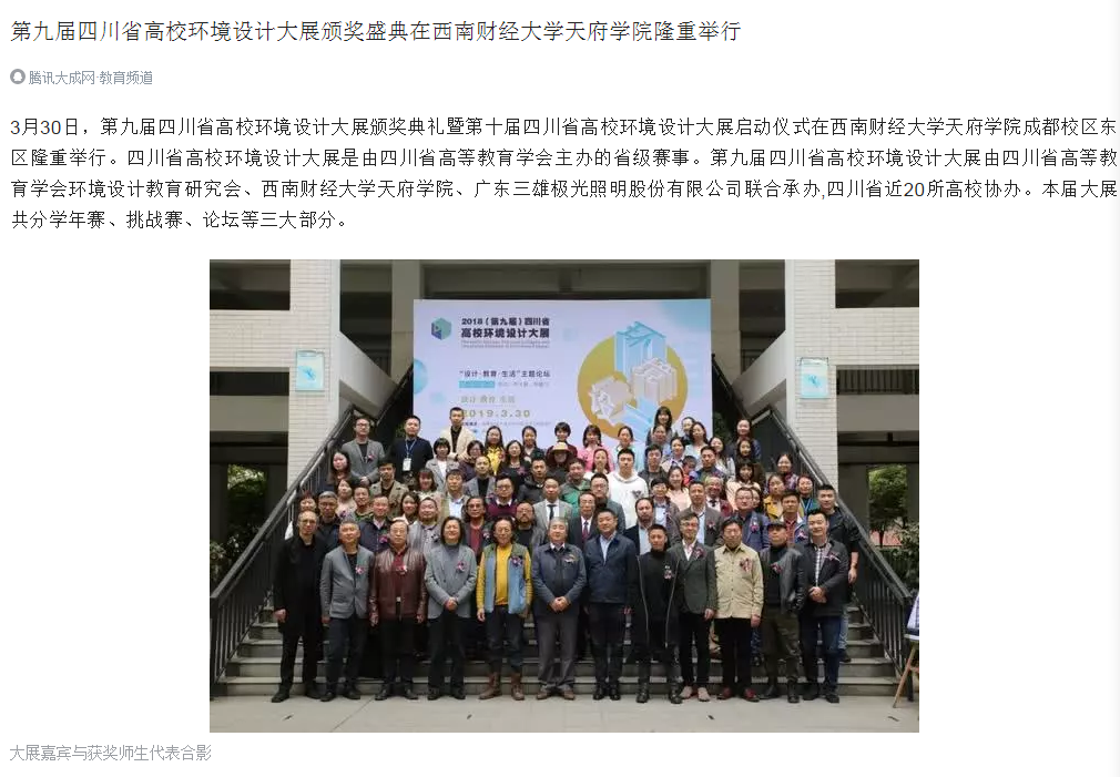 3月30日,第九届四川省高校环境设计大展颁奖典礼暨第十届四川省高校环境设计大展启动仪式在开云kaiyun体育成都校区东区隆重举行。四川省高校环境设计大展是由四川省高等教育学会主办的省级赛事。第九届四川省高校环境设计大展由四川省高等教育学会环境设计教育研究会、开云kaiyun体育、广东三雄极光照明股份有限公司联合承办,四川省近20所高校协办。本届大展共分学年赛、挑战赛、论坛等三大部分。