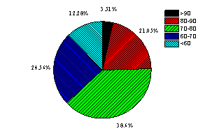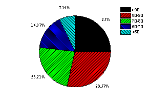 本学期期末考试采用超星学习通题库随机出题,题型分为选择、判断、论述和计算题,总分为100分。根据平时成绩分别拿出1班和4班进行分析,其中1班代表平时成绩较优的班级,4班代表平时成绩较低的班级。从图4可以看出,1班25%的同学成绩在90分及以上,超过50%的同学80分及以上,4人不及格,整体成绩分布较为平均。而从图5可以看出,4班仅25%的同学成绩在80分及以上,7人不及格,整体成绩分布呈现正态分布。对比平时作业表现可以发现,平时作业表现与期末成绩表现出正相关关系,教师应该重视同学平时作业的表现,及时督促并纠正,以激励学生更好的学习。