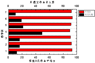 图3给出了7个教学班作业情况对比,包括7个班的9次作业平均分(仅统计已交的作业)和未交作业总人数。不难发现,4班的作业未完成率远高于其他班级,且课程均分最低,这启示教师需要重点督促该班级同学完成平时作业。同时我们发现作业未交总人数和班级作业平均分基本呈负相关关系,故教师及时监督学术完成平时作业,有利于改善班级整体学习氛围,提高学习成绩。