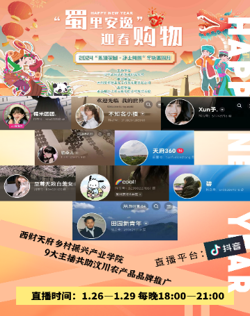 1月26日至29日,为进一步加深校企合作,加强农村电商应用型人才培养,推动汶川县乡村振兴事业和地方发展,乡村振兴产业学院联合汶川县绿库食品有限公司开展“蜀里安逸”迎春购物校企合作实践活动。活动宣传乡村振兴产业学院教师佘脊、杜民帅和姚望组织9名学生主播开展抖音直播,主推汶川县农副产品腌醋制品。9名充满朝气和创意的学生主播,在直播中充分发挥了自己的才艺和创意。他们或讲述腌醋的历史渊源,或展示腌醋的制作过程...