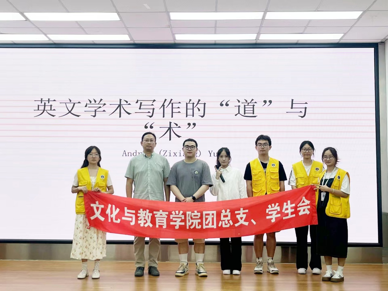 为了培养学生的英文学术写作基本能力和研究技能,了解英文学术论文写作规范,掌握英文学术写作技巧,文化与教育学院团总支科技实践部于5月27日在实验楼110教室举办了“英文学术写作的‘道’与‘术’”主题讲座。此次讲座特别邀请了语言教育硕士Andrew (Zixiang) Yu老师担任主讲人,嘉宾有文化与教育学院教师郑旭、刘洋,共计110名学生参加。讲座开始,Andrew (Zixiang) Yu以问题“什么是英文学术写作?”引导大家稍作思考后,向...