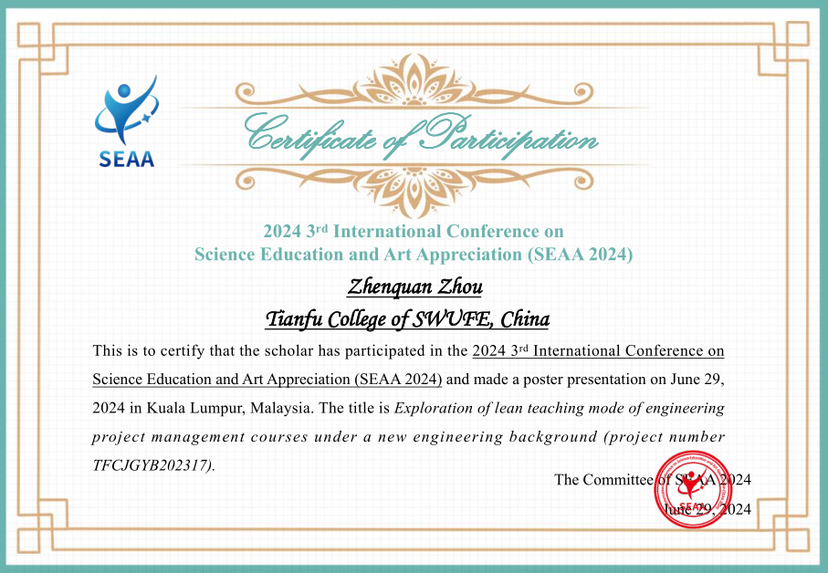 2024年第三届科学教育与艺术鉴赏国际学术会议(SEAA 2024)于2024年6月28至30日在马来西亚吉隆坡召开,本次国际会议主要围绕科学教育和艺术鉴赏等研究领域展开讨论,旨在为相关领域的专家学者及企业发展人士提供一个分享研究成果、讨论存在的问题与挑战及探索前沿科技的国际性合作交流平台。学校建筑与工程学院教师周桢佺受邀参与本次国际学术会议并进行教学成果交流展示,题目为Exploration of lean teaching mode of engineerin...