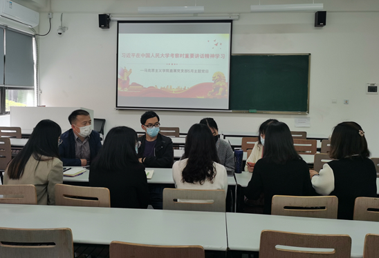 【马克思主义学院】学院组织开展本年度第9期教研活动5月18日下午,马克思主义学院开展本年度第9期政治理论学习和教研活动,会议由余利利老师主持,德阳校区全体专职教师参会。会议现场政治理论学习阶段。胡金亮带领大家重点学习了“习近平在中国人民大学考察时的讲话”“习近平在庆祝中国共产主义青年团成立100周年大会上的讲话”,强调了思政课程建设的重要性,分享了对教育根本问题的看法。杨燕认为,党和国家的希望寄托在青...