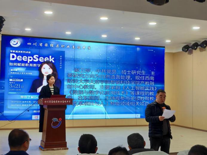 3月21日,智能科技学院产教融创中心教师谢卫婷受邀前往雅安市荥经县职业高级中学,开展主题为“人工智能赋能教育:DeepSeek助力教学革新”的专题讲座。此次讲座旨在分享人工智能技术在教育领域的创新应用,探讨如何通过AI工具提升教学效率和质量,助力教育现代化发展。荥经县职业高级中学全体教师参加了此次讲座,现场气氛热烈,反响积极。 谢卫婷主讲讲座讲座现场,谢卫婷首先介绍了人工智能(AI)在教育领域的广泛应用,指出AI作为一门模拟人类智能的科学,...