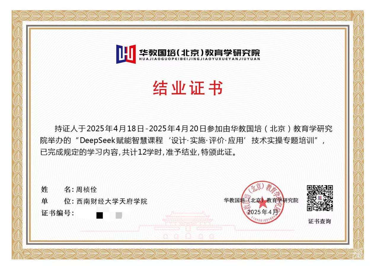 为积极落实国家教育数字化战略行动,促进智能技术与教育教学、科学研究深度融合,推动人工智能赋能教育转型,实现信息技术与教育教学深度融合,华教国培(北京)教育学研究院于4月18日至4月20日在厦门举办DeepSeek赋能智慧课程“设计·实施·评价·应用”技术实操专题培训会。工程与材料学院教师周桢佺受邀参与本次专题会议,并就DeepSeek在智慧课程建设与教学实践中的创新应用等方面在研讨会上展开学习与交流。 学院教师本次专题研讨会学习证书本次专题学习研讨会的参与促进了本院教师在智慧课程的设计、...