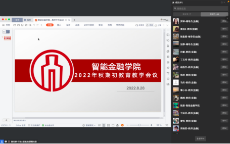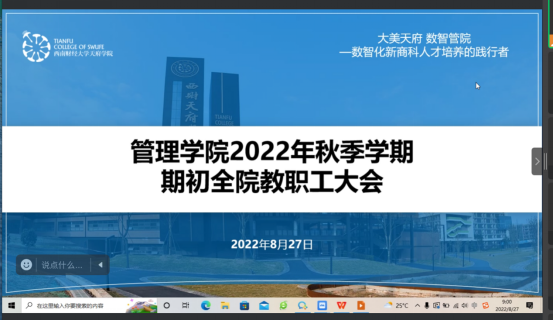【现代服务管理学院】用心育人,尽心履责-学院组织召开2022年秋季学期期初全院教职工大会2022年8月27日上午,现代服务管理学院通过企业微信(线上)组织召开2022年秋季学期期初全院教职工大会。会议由学院党总支书记倪娅主持,学院领导班子成员及全院教职工参加大会。会议截图会议上,倪娅首先带领全院教职工深入学习《习近平经济思想学习纲要》,号召全体教师用党的创新理论武装头脑、指导工作、推进教学,努力将学习成果...