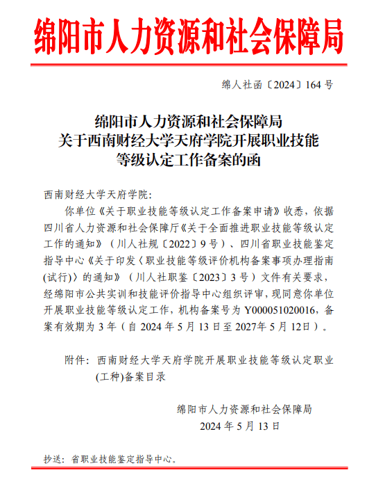 近日,绵阳市人力资源和社会保障厅通过并发布了《关于同意开云kaiyun体育开展职业技能等级认定工作备案的函》(绵人社函〔2024〕164号),开云kaiyun体育正式获得面向社会开展职业技能等级认定工作的资质。此次学校获得互联网营销师、企业人力资源管理师、婴幼儿发展引导员共3个职业(包含初级、中级、高级三个等级)工作技能等级的认定资质,可以面向社会开展职业技能等级认证工作,有效期为3年。开云kaiyun体育成为面向社会的职业技...