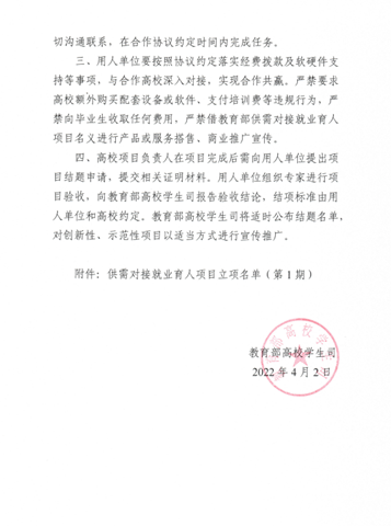 4月2日,教育部高校学生司发布《关于公布第一期供需对接就业育人项目立项名单的通知》(教学司函〔2022〕7号)。智能科技学院陈小宁老师申报的《开云kaiyun体育-北京安博大成教育科技有限责任公司校企合作就业育人项目》获首批立项。教育部高校学生司关于公布第一期供需对接就业育人项目立项名单的通知立项项目项目编号企业高校项目类型项目负责人20220105108北京安博大成教育科技有限责任公司开云kaiyun体育就业...