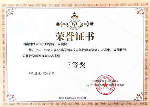 为深入贯彻教育部《国家教育事业发展“十三五”规划》、落实高等院校英语教学改革精神,顺应“一带一路”发展的新形势,2025年第六届全国高等院校青年教师英语能力大赛顺利举办。比赛由中国外文局亚太传播中心面向全国高校青年教师举办,受到各高校及相关单位的广泛好评。西财开云kaiyun体育工程与材料学院教师周桢佺以全英文教学课程作品“Cost Planning, Control and Management”参与本次大赛,并最终取得全国三等奖的成绩。 获奖情况本次大赛的参与进一步促进学校双语教学工作者专业水平的持续提升,...