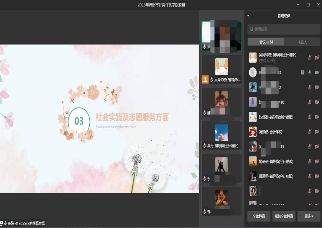 ?为充分发挥典型引领和示范作用,带动全院学生以优秀模范为镜,向优秀典型看齐。3月3日,会计学院举行2022年绵阳市“三好”学生、优秀学生干部和先进班集体院级交流会。此次会议以企业微信为载体线上进行。会计学院党总支副书记冯梦然、会计学院党总支副书记严飞雷、各支部书记、副书记、代表老师出席担任评委,各支部学生代表旁听。经个人申请、支部筛选、学院审核,共2位三好学生、15位优秀学生干部及3个班集体参加本次交流...