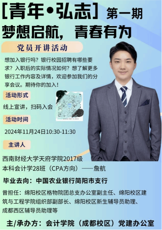 初心如炬明方向,先锋似旗展担当。为促使党员同志更加积极主动地践行自身使命,用扎实的行动彰显党员的责任与担当,2024年11月,会计学院(成都校区)党建办公室继续开展了“青年·笃行”系列活动之毕业生党员先锋领航活动。此次活动以设立党员先锋岗为契机,引导党员同志在实践中锤炼本领,于服务里彰显担当,从而激活党组织的“神经末梢”,凝聚起更强大的发展合力。 彭鑫同志深入学习“四个一”的重要内容 宋城玲同志认真研读《党的二十届三中全会〈...